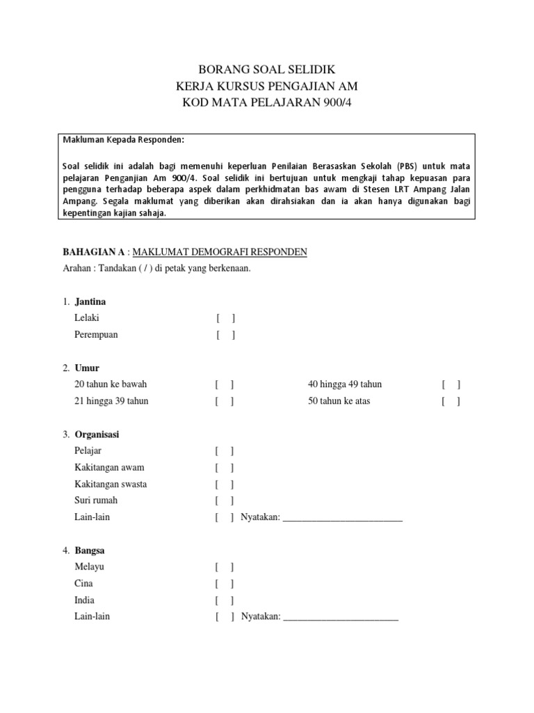 Doc Borang Soal Selidik Kerja Kursus Pengajian Am Kod Mata Pelajaran 900 4 Nurul Farhana Academia Edu